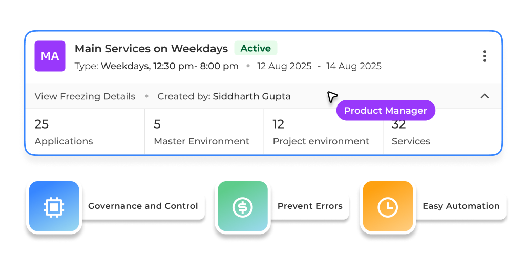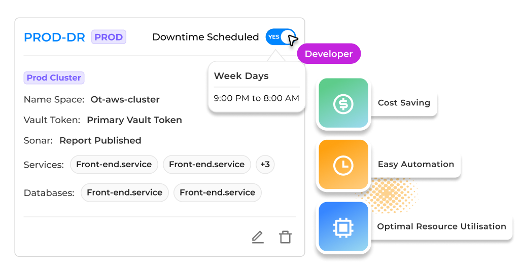 Achieve smart cost savings with automated environment downtime management. Seamlessly start or stop microservices, shut down entire environments when idle, and ensure systems remain inactive during non-business hours—optimizing resource usage, reducing waste, and lowering operational expenses without disrupting productivity.